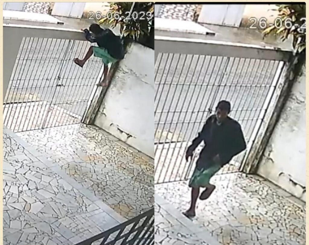 No vídeo é possível ver o momento em que um homem vestindo com um casaco preto e uma bermuda verde, chega no local é pula o muro da residência.