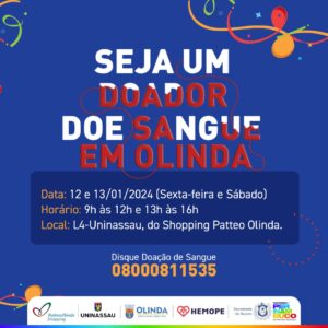 Hemope realiza campanha para doação de sangue em Olinda A ação conta com a parceria da gestão municipal Victória Campos A Fundação de Hematologia e Hemoterapia de