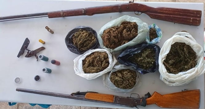 Foi feita uma varredura no local e encontrado um balde com sacos de maconha pronta para o consumo, que juntos pesavam 800g da erva. Os policiais também encontraram  dentro de um cano de PVC, outra espingarda, sendo esta calibre .20, além de dois potes pequenos contendo chumbo, um pote pequeno contendo pólvora, uma caixa de espoleta, dois cartuchos de calibre .20 intactos, um cartucho deflagrado e dois feixes de espingarda artesanal.