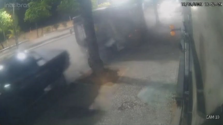 Imagens registradas por câmeras de segurança mostram a caminhonete preta estacionada na avenida quando o ônibus sobe a calçada, bate numa árvore e atinge o carro por trás. O veículo é empurrado, enquanto o coletivo para ao se chocar com uma segunda árvore.