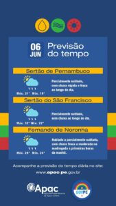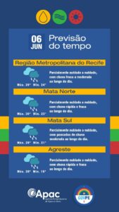 A Agência Pernambucana de Águas e Climas (APAC) indica que esta quinta-feira (6) terá céu nublado e pancadas de chuva do litoral ao sertão do estado.