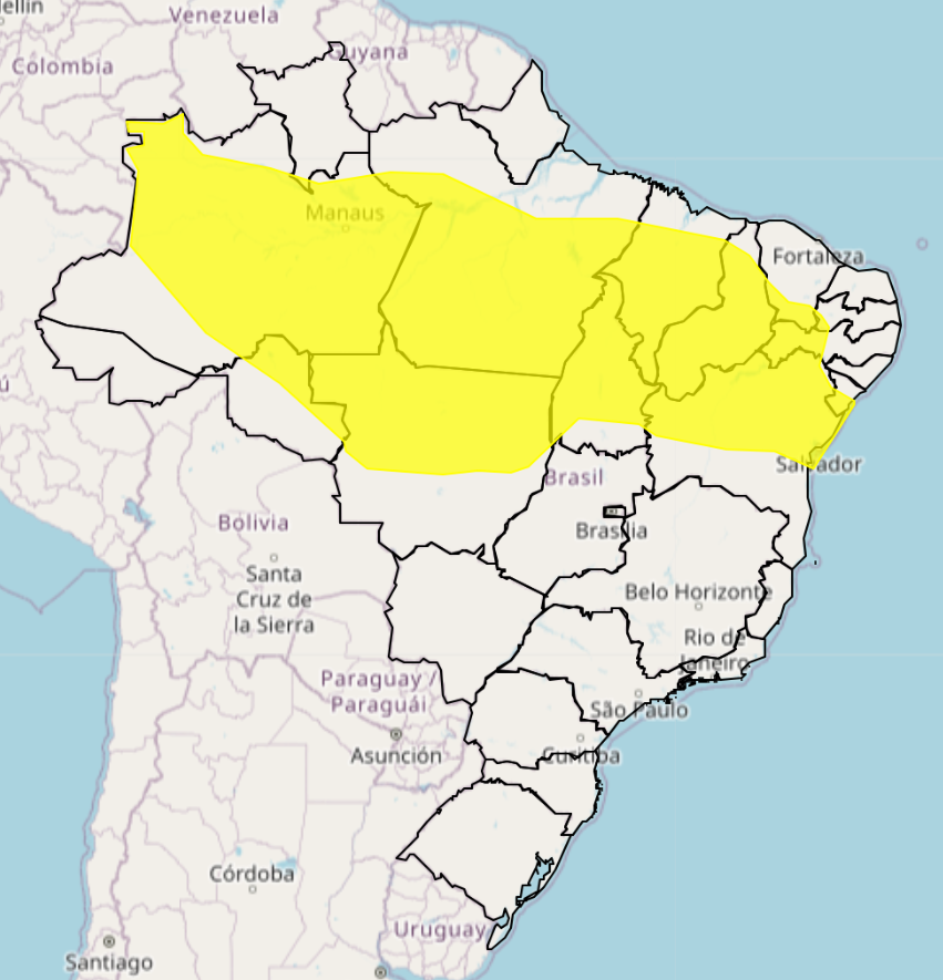 O alerta amarelo, de menor gravidade, também se estende a outras regiões do país, com possibilidade de alinhamento de frentes úmidas e instabilidade atmosférica.